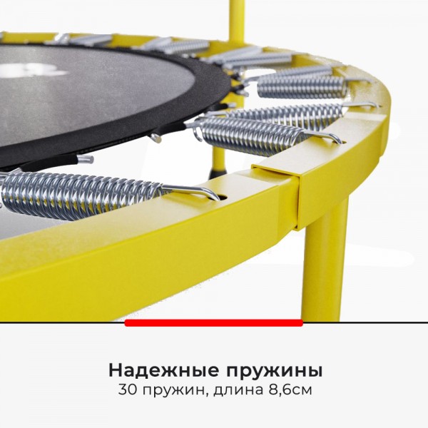 Прыжковое полотно натянуто на 30 пружин, которые закрыты специальным матом. Комфортный поручень имеет диаметр 19,1 мм.