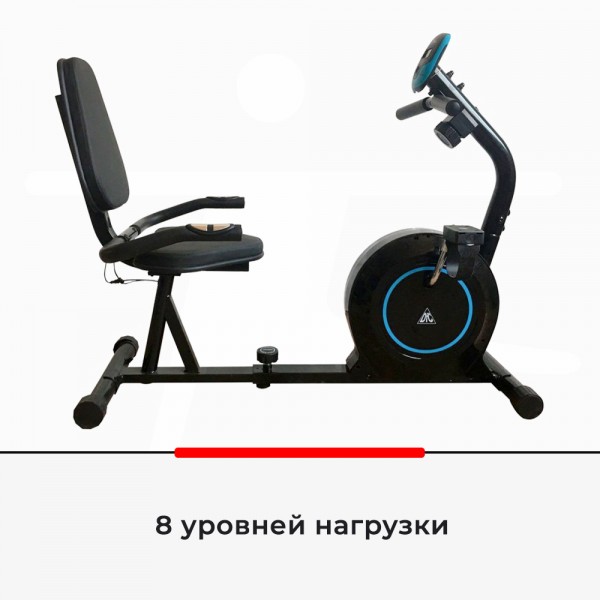 Конструкция предлагает 8 уровней сопротивления с механическим переключателем на корпусе. Удобное кресло можно настроить по горизонтали. Есть встроенные в поручни датчики пульса.