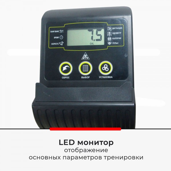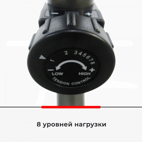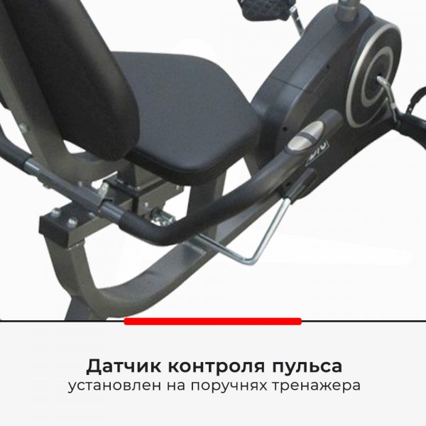 Тренажер предусматривает ручную регулировку нагрузки (8 уровней). Сидение с удобной спинкой регулируется в горизонтальной плоскости, а на педалях расположены ремни фиксации. Для считывания частоты пульса в поручни вмонтированы специальные датчики.