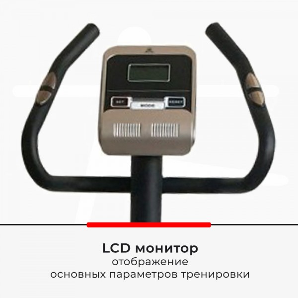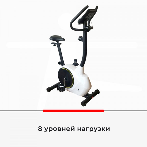 Модель имеет 8 уровней сопротивления, которые можно переключать вручную на корпусе. Есть настройка высоту сидения. Для безопасности установлены ремни фикции с регулировкой на педалях. В поручни вмонтированы датчики контроля частоты пульса. Предусмотрена подставка для планшета.