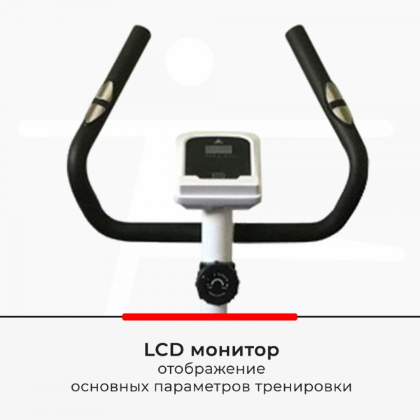 Спортсмен может вручную выбрать 8 уровней нагрузки. Есть изменение высоты седла, а широкие педали имеют удобные ремни для фикции стопы с регулировкой. Контроль пульса осуществляют датчики в поручнях. На корпусе расположена подставка для планшета.