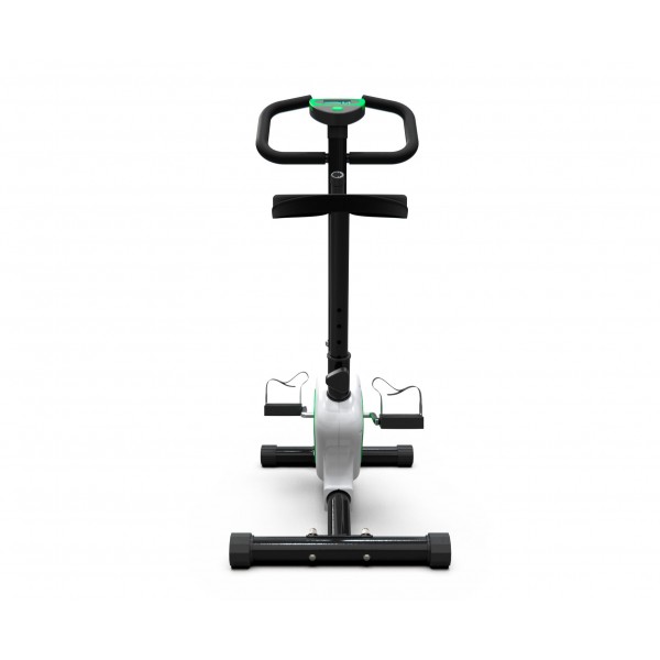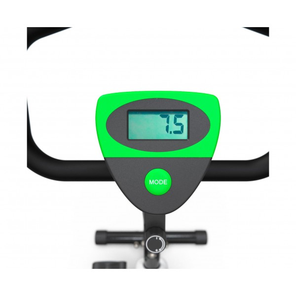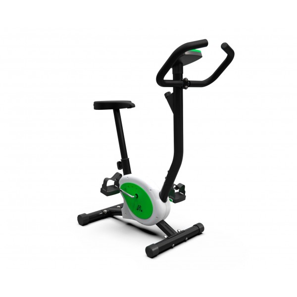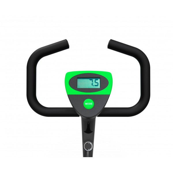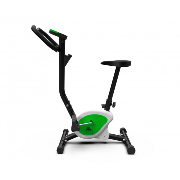 DFC B8006 – домашний велотренажер с вертикальной посадкой и ограничением веса пользователя в 100 кг. Компактная модель в привлекательном корпусе с зелеными вставками.