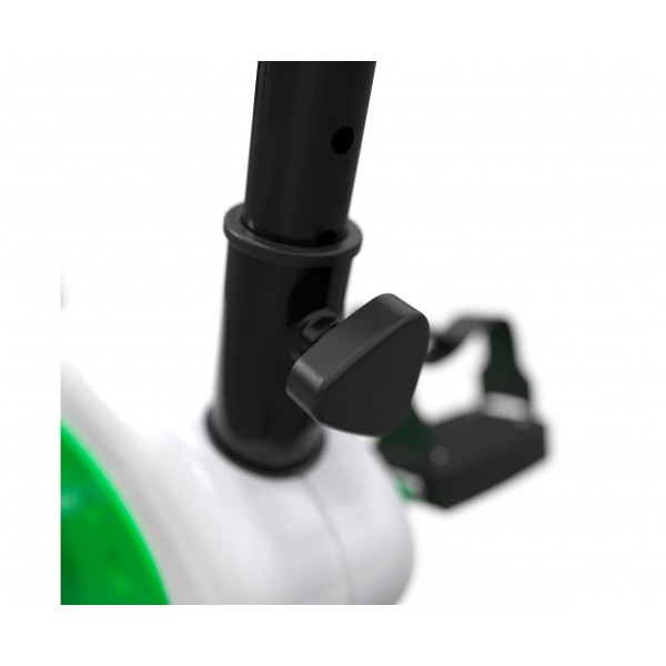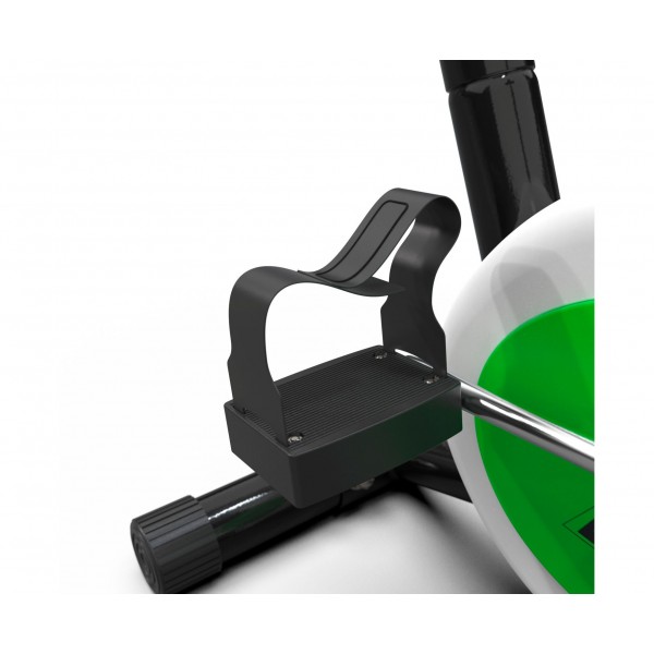 Нагрузка тренажера создается маховиком 4 кг. Предусмотрена простая настройка регулятором на центральной стойке. Есть 7 уровней высоты седла. Педали имеют ремни для фиксации стопы.