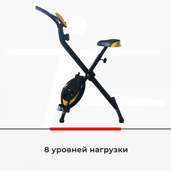 Конструкция предлагает ручную регулировку нагрузки (8 уровней). На педалях ноги надежно фиксируются ремнями. Есть настройка высоты седла.