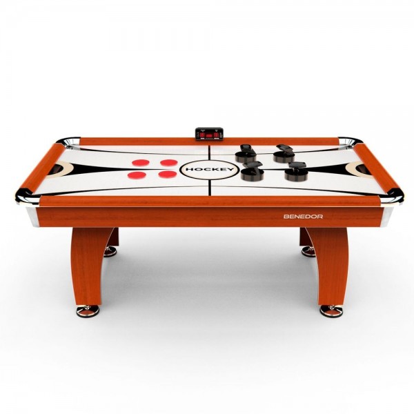 DFC BENEDOR - игровой стол для аэрохоккея самого большого размера из предлагаемых брендом. Модель изготовлена из МДФ с защитным покрытием, а стойки хромированы. Для улучшения отскока шайбы внутренняя часть бортиков сделана из упругого пластика.