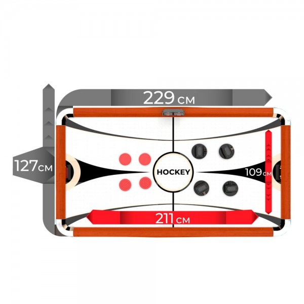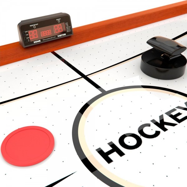 Конструкция включает двойной вентилятор, благодаря чему скольжение максимально похоже на реальное на льду, сопротивление минимально. Подсчет забитых шайб выполняется автоматически и отображается на электронном табло. Можно выбрать режим игры. Стол комплектуется четырьмя битами и четырьмя шайбами.