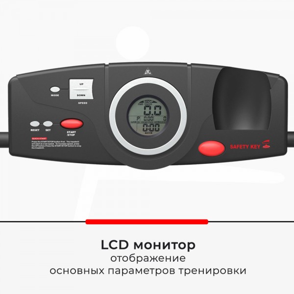 Конструкция дорожки включает прорезиненные держатели по всей длине полотна. Предусмотрен ключ безопасности с фиксацией на любом предмете одежды, чтобы пользователь мог сразу выключить тренажер. Включить устройство можно уже с пациентом на дорожке.