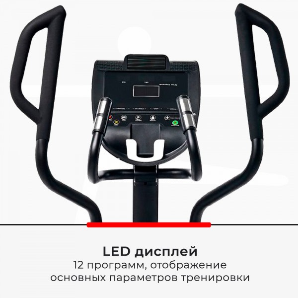 Тренажер оснащен маховиком с реальным весом 12 кг и предоставляет выбор 32х уровней нагрузки. Длина шага 50,8 см позволяет провести тренировку даже высоким спортсменам, интервал между педалями составляет 8,03 см. Предусмотрена проверка пульса.