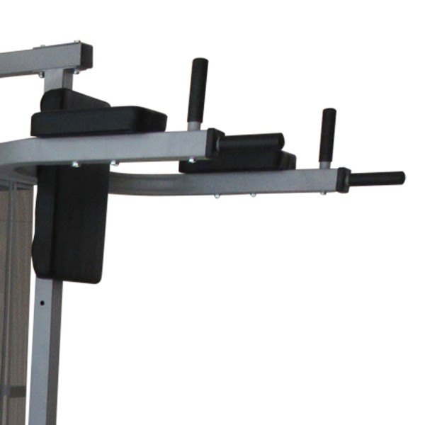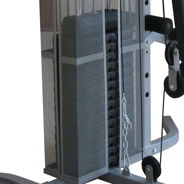 Модель изготовлена из надежной металлической рамы. За безопасный подъем грузовых плит отвечают стальные тросы и кожух корпуса, а ролики на подшипниках гарантируют плавность работы. Мультистанция включает: