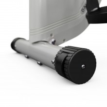 Тренажер имеет ролики для перемещения в помещении, а также подставку для аксессуаров.