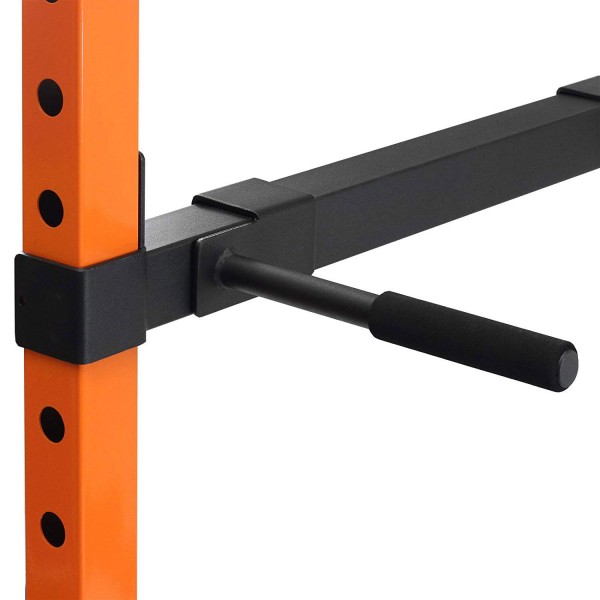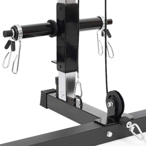 Для нагрузки можно установить диски 26 мм или олимпийские 50 мм (через адаптер). Дополнительную надежность конструкции можно придать фиксацией по углам на полу (крепления в комплект не входят). Рама оборудована:
