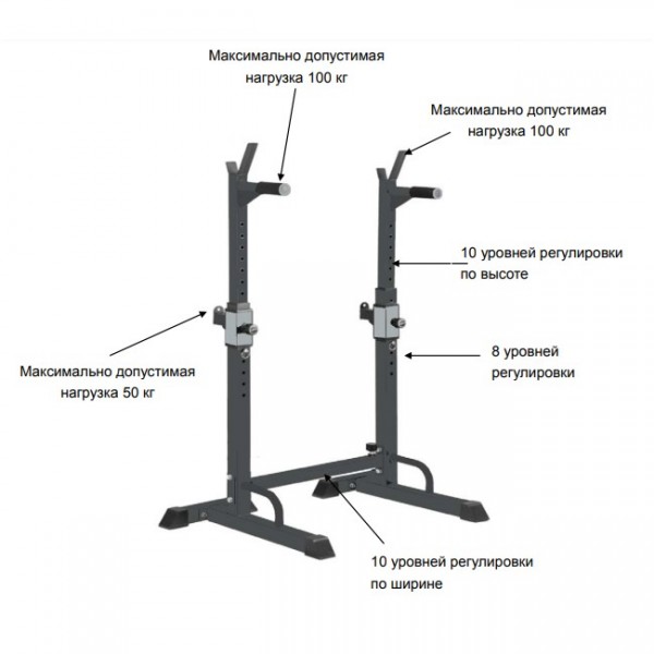 | Нагрузка | до 100 кг на кронштейны для штанги и на брусья, до 50 кг на подвижный держатель |