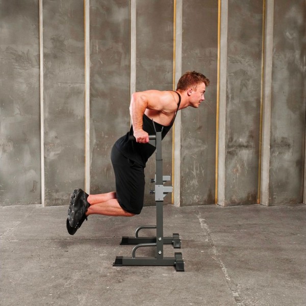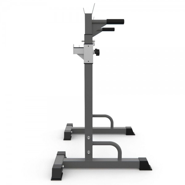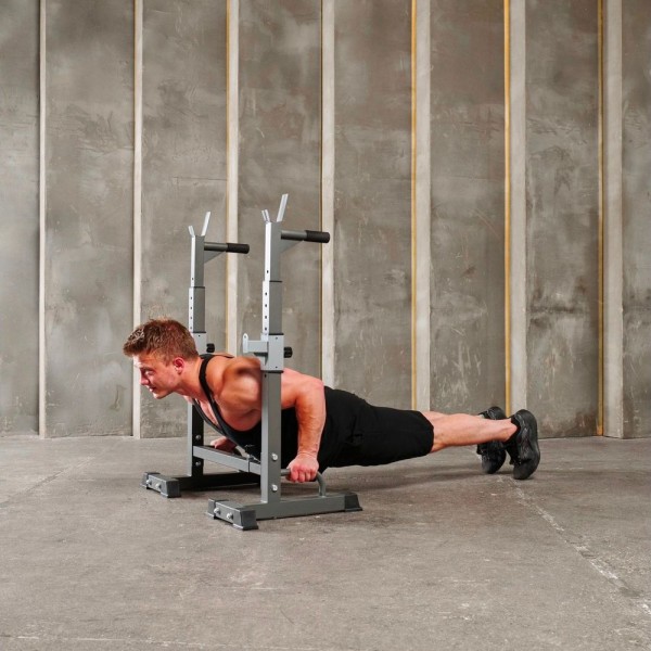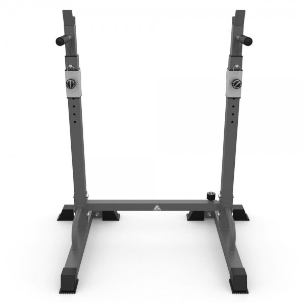 DFC DS10 позволяет выполнять упражнения со штангой и упражнения на брусьях, также можно отжиматься от пола. Нагрузка до 100 кг на держатели для штанги и брусья, до 50 кг на подвижный держатель.