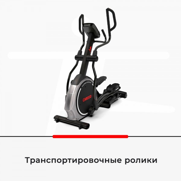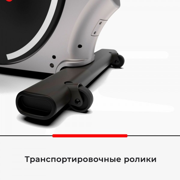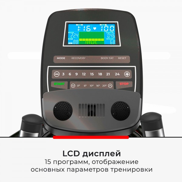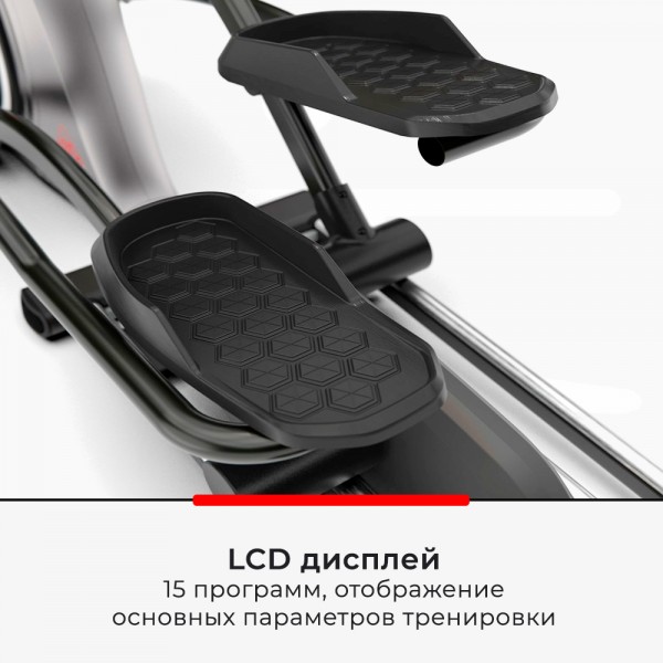 Конструкция использует маховик реальным весом 12 кг (инерционный 24 кг). Предусмотрено изменение наклона до 20 градусов (5 вариантов). Длина шага будет удобна и при высоком росте спортсменов, также отметим небольшой межпедальный интервал. Установлены датчики для проверки работы сердца.