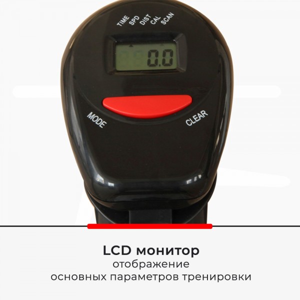 Модель предлагает восемь уровней нагрузки, изменяемые вручную. Педали эллипсоида изготовлены с бортиком, их поверхность не скользит. Длина шага составляет 28 см.