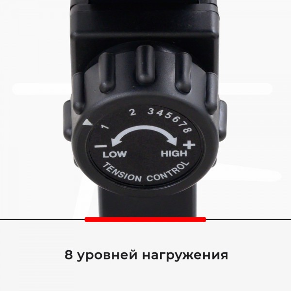 Модель воспроизводит подъем в гору. Предусмотрено 8 уровней нагрузки, есть механический переключатель. Педали с бортиком не скользят, а на поручнях установлены мягкие накладки.