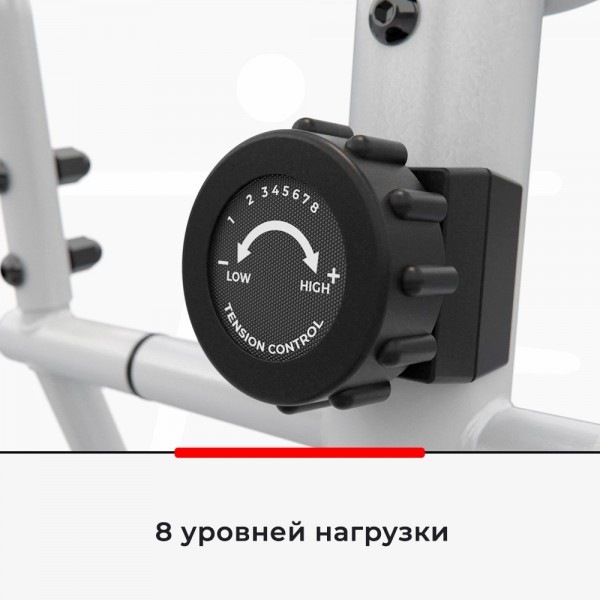 Тренажер обеспечивает 8 вариантов нагрузки с ручным переключением. Комфортные педали с нескользящей поверхностью установлены на расстоянии 26,5 см. Длина шага у данной конструкции составляет 28 см. Есть возможность проверить работу сердца, прикоснувшись к датчикам проверки пульса на поручнях.