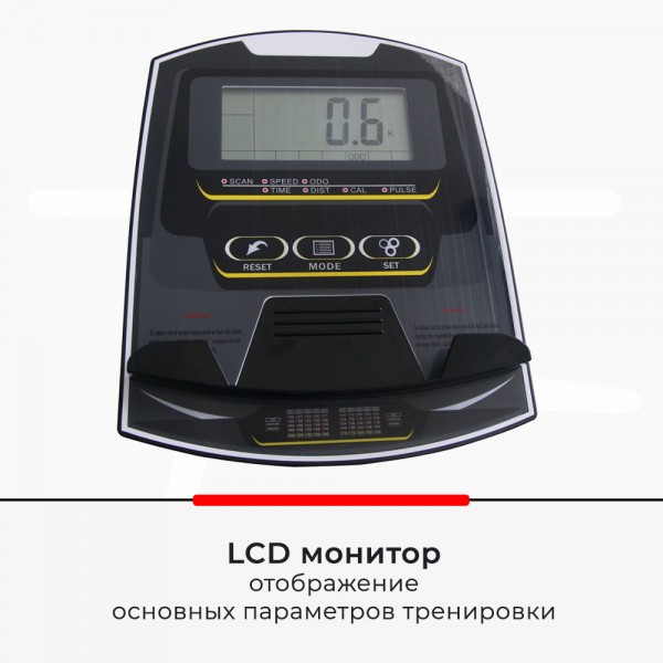 Предусмотрена ручная регулировка (механическая) нагрузки - 8 уровней. Широкие педали обладают рифленой поверхностью и не скользят. Длина шага здесь увеличена до 40 см, а Q-фактор равен 20 см. Проверить частоту пульса можно через встроенные датчики на поручнях.
