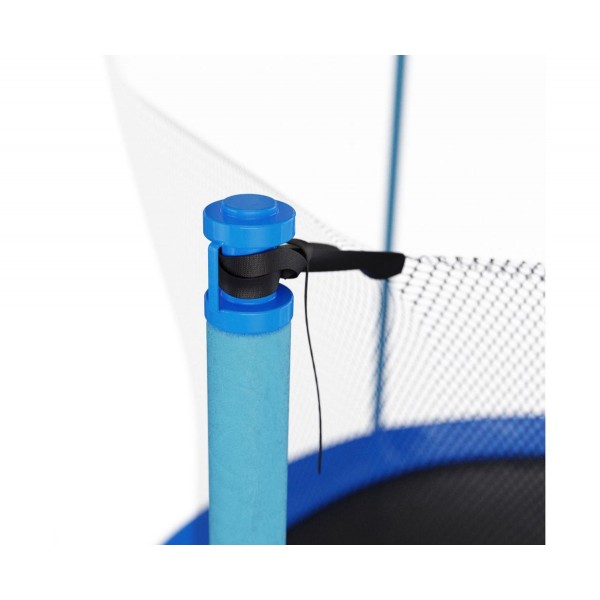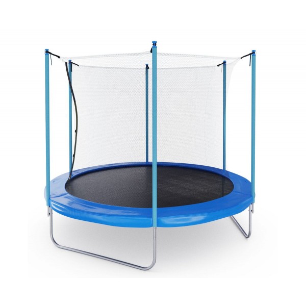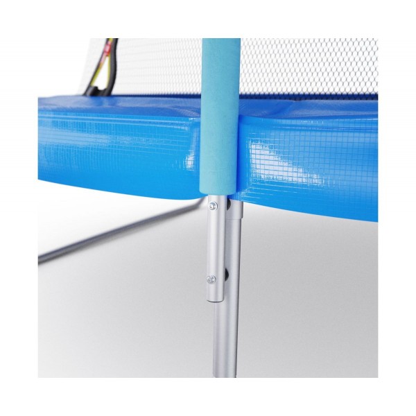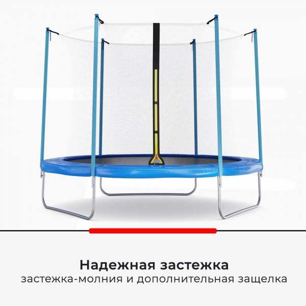 Конструкция батута основана на прочном стальном каркасе и пружинном блоке, сверху которого расположен защитный мат. Ножки батута обеспечивают стабильность и устойчивость изделия. Высота сети составляет 170 см, а вход закрывается на удобную застежку-молнию.