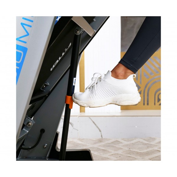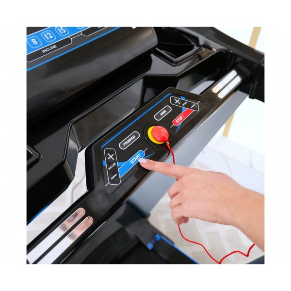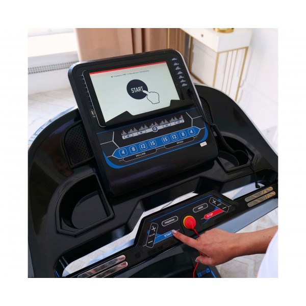 Тренажер основан на прочной раме и качественном беговом полотне, а мотор мощностью 4 л.с. позволяет достичь скорости бега до 20 км/ч. Подняв полотно до 20 градусов можно дополнительно усилить нагрузку (регулировка электронная). Установлена система амортизации для сохранения здоровья суставов. Сенсоры проверки пульса встроены в поручни.