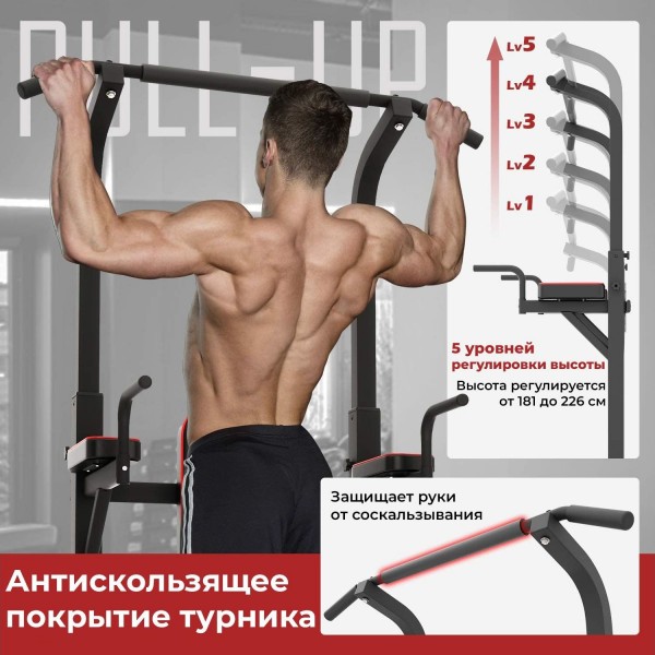 | Дополнительные характеристики | 5 уровней высоты (181-226 см), ширина турника 105 см |