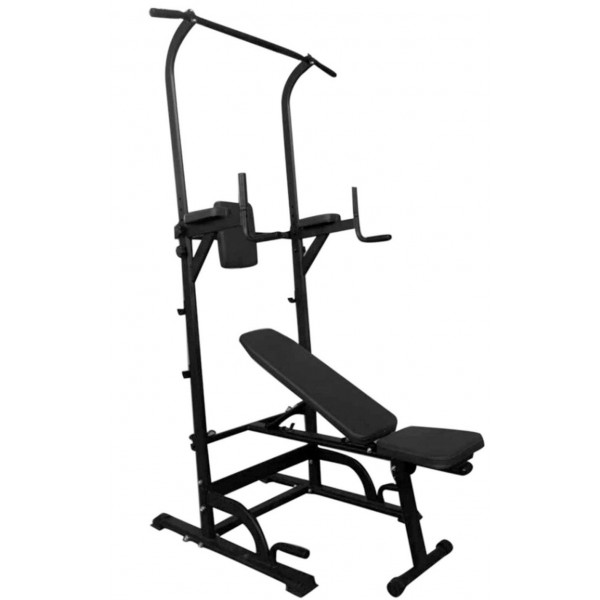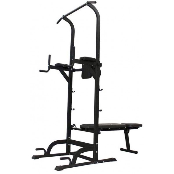DFC POWER TOWER G004 комплектуется скамьей, спинку которой можно устанавливать под разными углами, также можно наклонить всю скамью. Также предусмотрены крепления для тренировки со штангой. Стойка включает турник и брусья, можно качать пресс.