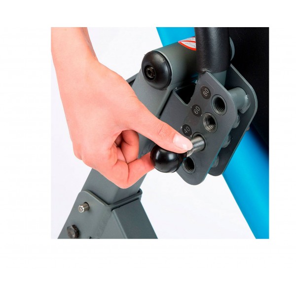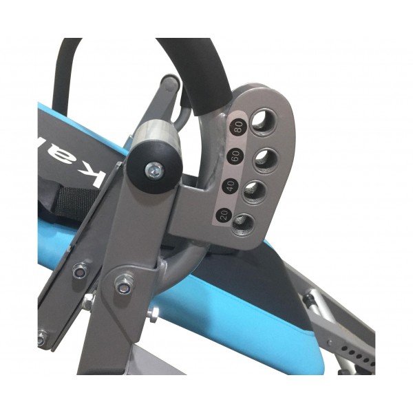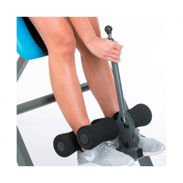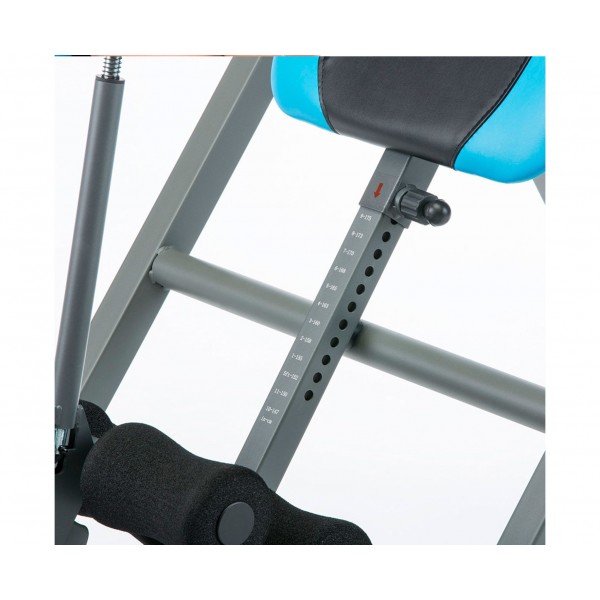 В этой модели можно задать необходимый угол специальным ограничителем (без него можно установить тренажер вертикально, головой вниз). Предусмотрена регулировка под рост 147-198 см. Обивка спинки из эко-кожи.