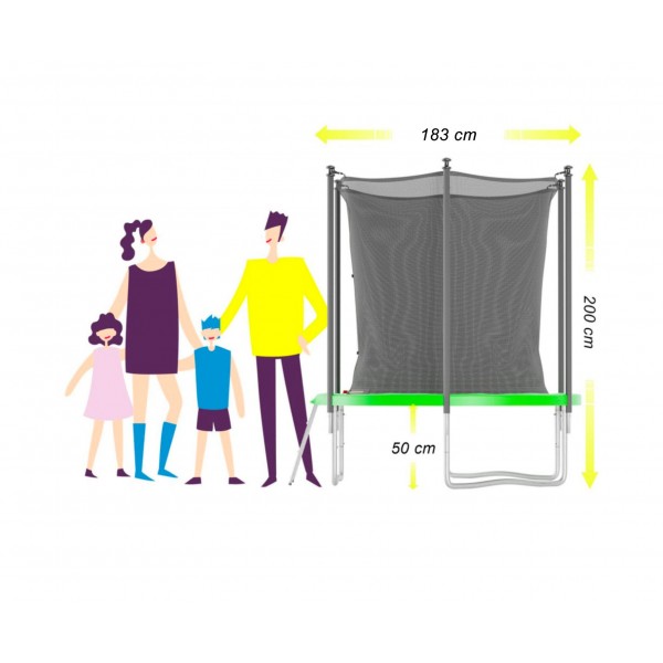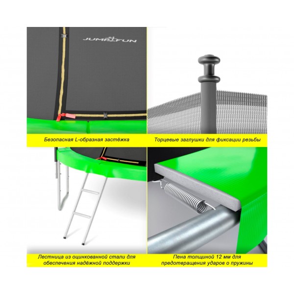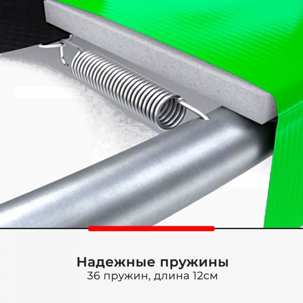 Надежное прыжковое полотно натянуто на прочные пружины, которые для безопасности закрыты специальным матом. Сеть высотой 2 м (в отличие от более низких стандартных моделей) имеет удобный замок на входную зону.