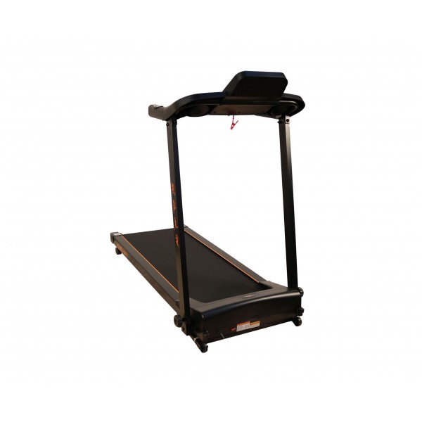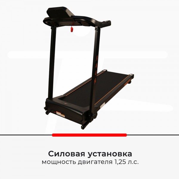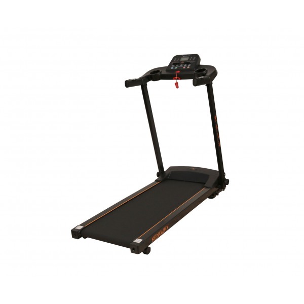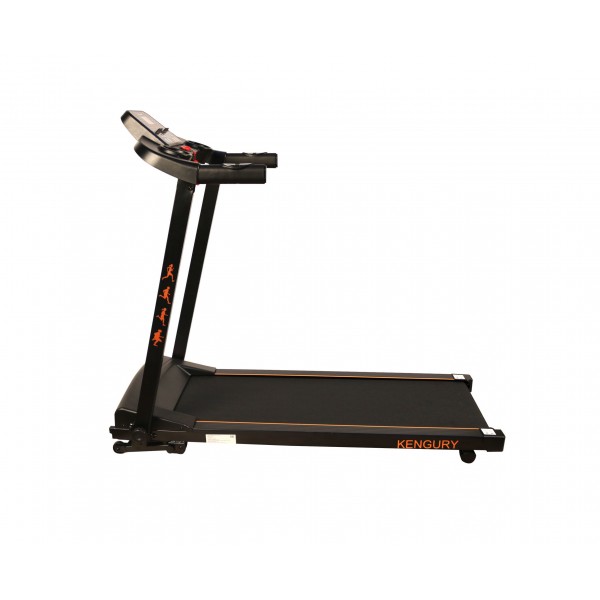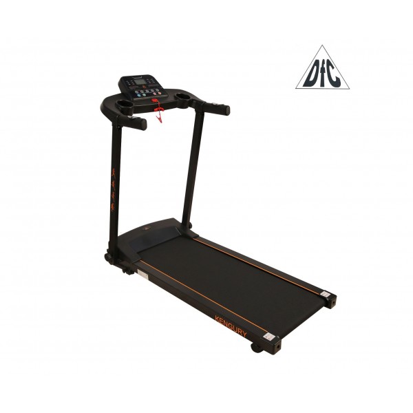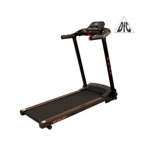 DFC KENGURY T122B – электрическая беговая дорожка с базовыми режимами тренировки для спортсменов массой до 100 кг. Модель в черно-оранжевом дизайне корпуса.