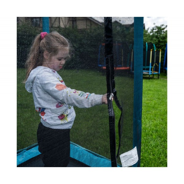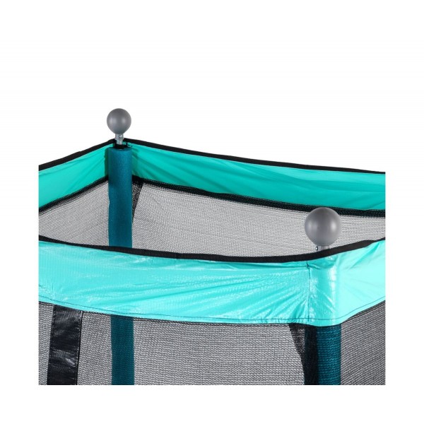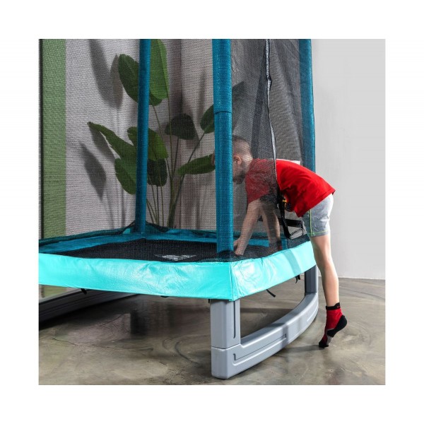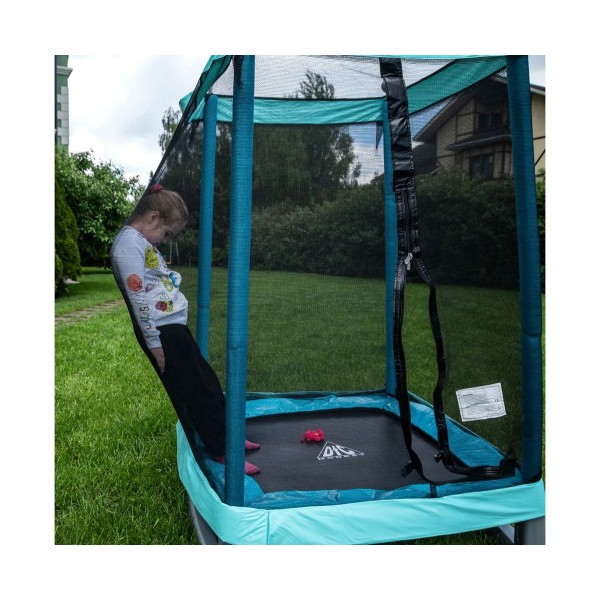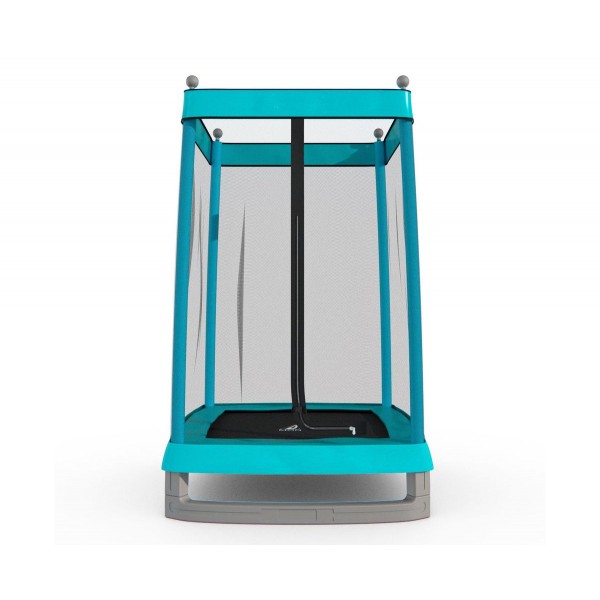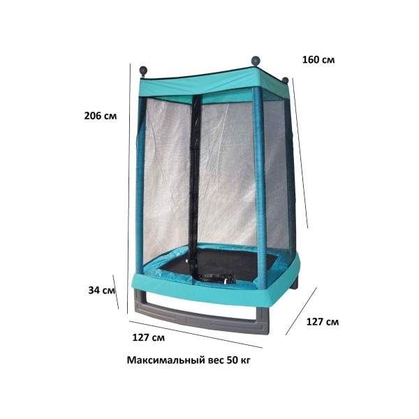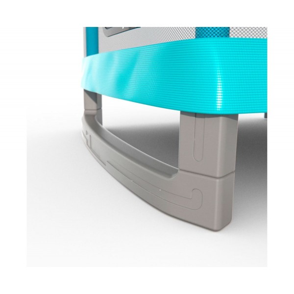 Конструкция основана на 4х трубах со специальной смягчающей прокладкой, вверху которых установлены шаровые заглушки. Небольшая высота от пола (34 см) позволяет использовать батут без лестницы. Вход закрывается на застежку молнию, с внешней стороны установлен дополнительный фиксатор, чтобы ребенок не мог выпасть.