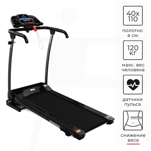 Мотор тренажера на 1,25 л. с. работает для обеспечения скорости до 12 км/ч. На поручнях есть контроль частоты пульса, а также кнопки управления скоростью и стартом. Наклон дорожки можно установить в трех положениях (механика). Тренажер просто складывается.
