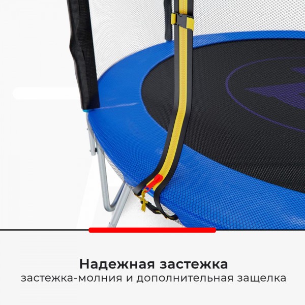 Пружинный блок обеспечивает безопасный прыжок, сверху натянут специальный многослойный защитный мат. Вход на батут закрывается на молнию.