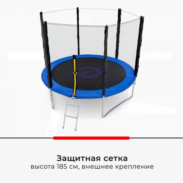 Батут DFC PELPO производится из надежных комплектующих и поставляется с внешней защитной сеткой. Также к батуту прилагается удобная лестница.