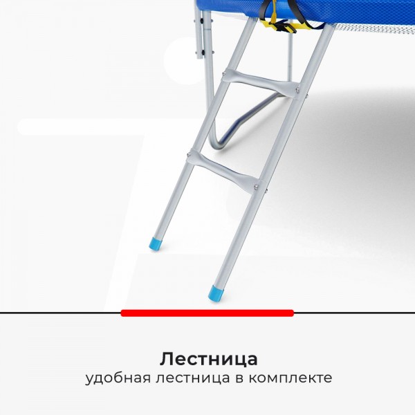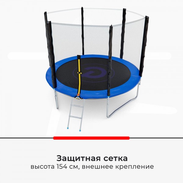 Батут DFC PELPO производится из надежных комплектующих и поставляется с внешней защитной сеткой. Также к батуту прилагается удобная лестница.
