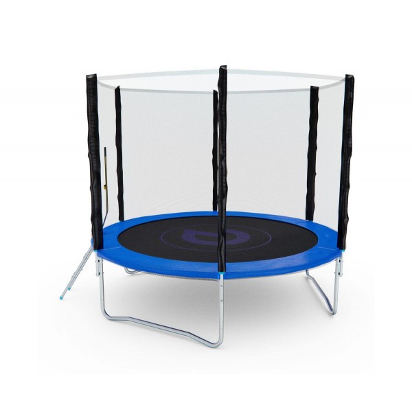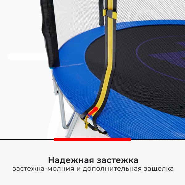 Пружинный блок обеспечивает безопасный прыжок, сверху натянут специальный многослойный защитный мат. Вход на батут закрывается на молнию.