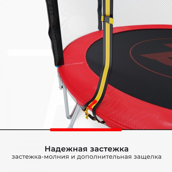 Пружинный блок обеспечивает безопасный прыжок, сверху натянут специальный многослойный защитный мат. Вход на батут закрывается на молнию.