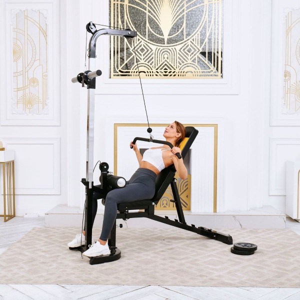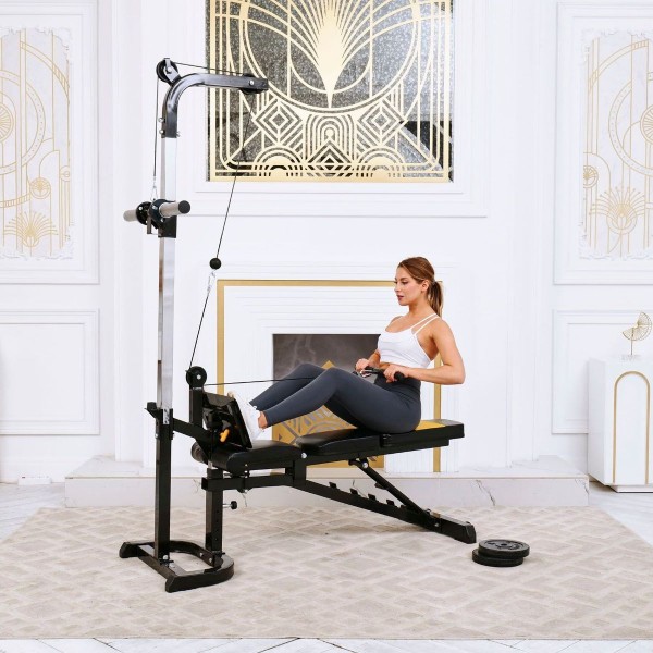 DFC Powertec – универсальная скамья в комплектации с верхней/нижней тягой. Трансформируется в "гребной" тренажер. Нагрузка на тяги до 136 кг, на скамью до 250 кг.