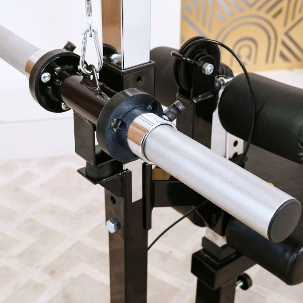 Для утяжеления можно использовать диски 51 мм (приобретаются отдельно). Широкий гриф и ручка для нижней тяги прилагаются.