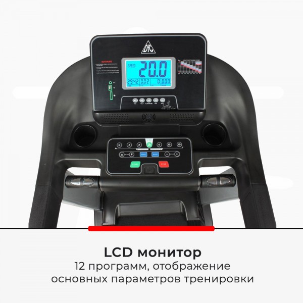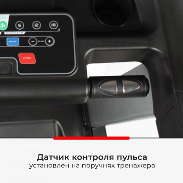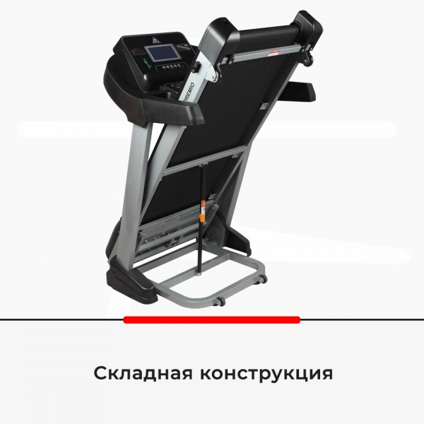В основе конструкции тренажера лежит прочная рама и надежная дека толщиной 2 см, а за движение полотна отвечает двигатель на 2,5 л.с., гарантирующий скорость до 20 км/ч. Угол наклона до 12 градусов меняется электронно. На поручнях дорожки встроен контроль движения и сенсоры пульса. Можно использовать кардиопояс (в комплект не входит). Тренажер можно сложить для хранения.