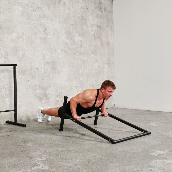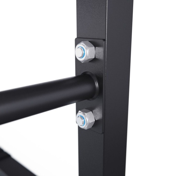 Диаметр перекладин составляет 38 мм. На тренажере можно выполнять отжимания и подтягивания в разных комбинациях. Брусья легко убрать за счет раздельной конструкции.