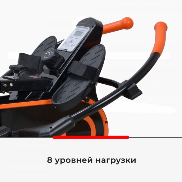 Для нагрузки тренажера используются два гидравлических цилиндра. Внизу каждого из них есть регулятор уровня сопротивления (12 положений).