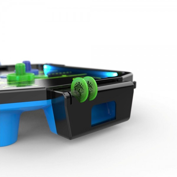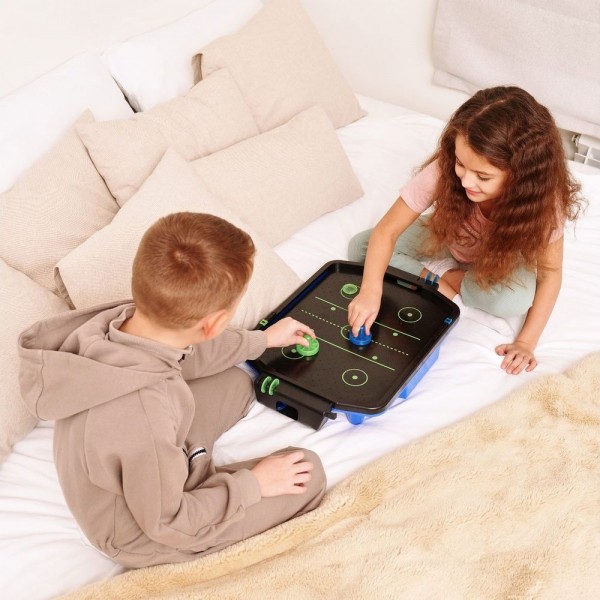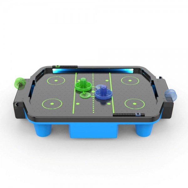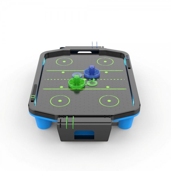 DFC SB-AT-2711 - небольшой настольный аэрохоккей, который может работать от кабеля USB (в комплекте) или от батареек (приобретается отдельно). Стол имеет синюю неоновую подсветку, а также звуковые эффекты. Модель изготовлена из прочного полипропилена, который долговечнее и легче в уходе чем традиционный МДФ. Шайбы изготовлены из светоотражающего пластика и светятся в темноте. Счетчики очков - механические.