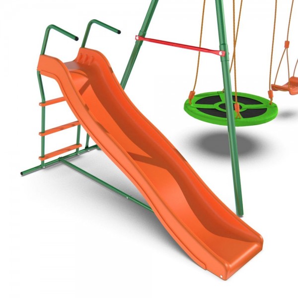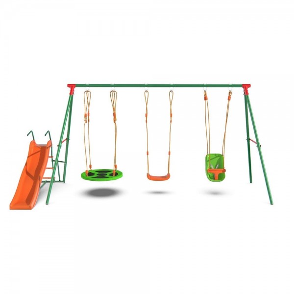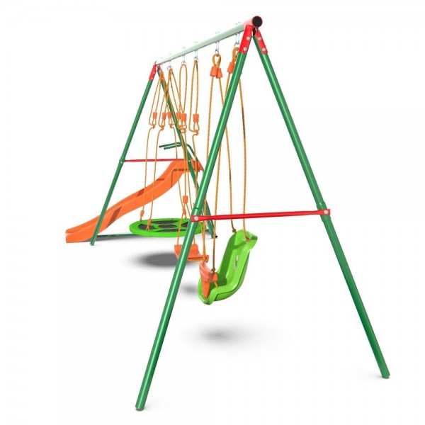 DFC SBN-03 – игровой комплекс для детей 3-10 лет, одна качель для малышей от 18 месяцев. В составе три варианта качелей и горка. Нагрузка до 145 кг.
