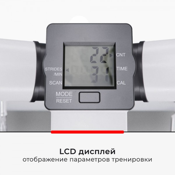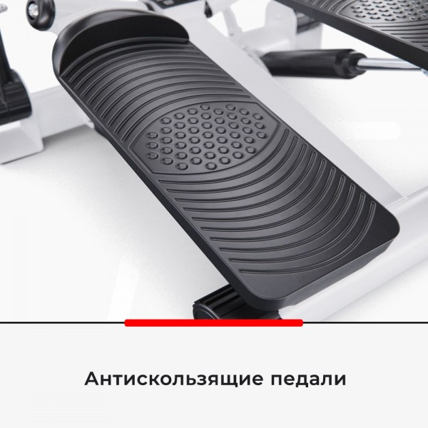 Нагрузка создается гидроцилиндрами, ход педалей взаимозависимый. Поворотом ручки можно усилить или уменьшить сопротивление. Поручни установлены на расстоянии 45,4 см.