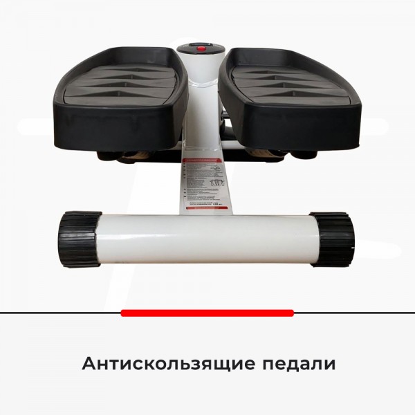 Конструкция использует для создания нагрузки гидравлический привод с пружинной амортизацией (каждые 20 минут следует делать перерыв). Педали выполнены с антискользящим покрытием. В комплект входит специальный защитный коврик.