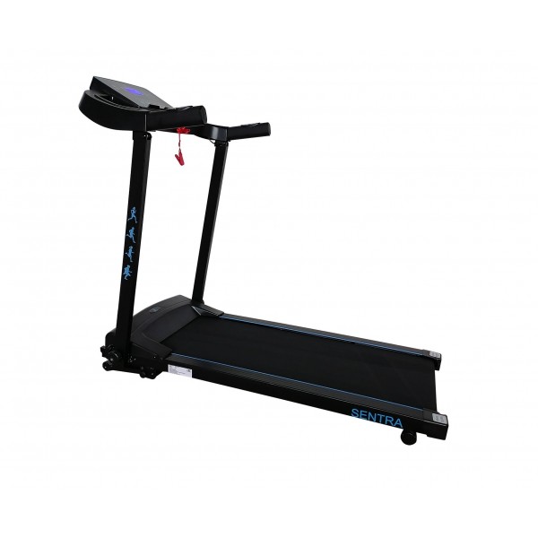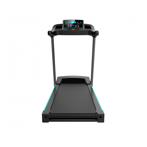 DFC SENTRA T123S – электрическая беговая дорожка с целевыми режимами тренировки для пользователей массой до 100 кг. Модель в черно-голубом дизайне корпуса.