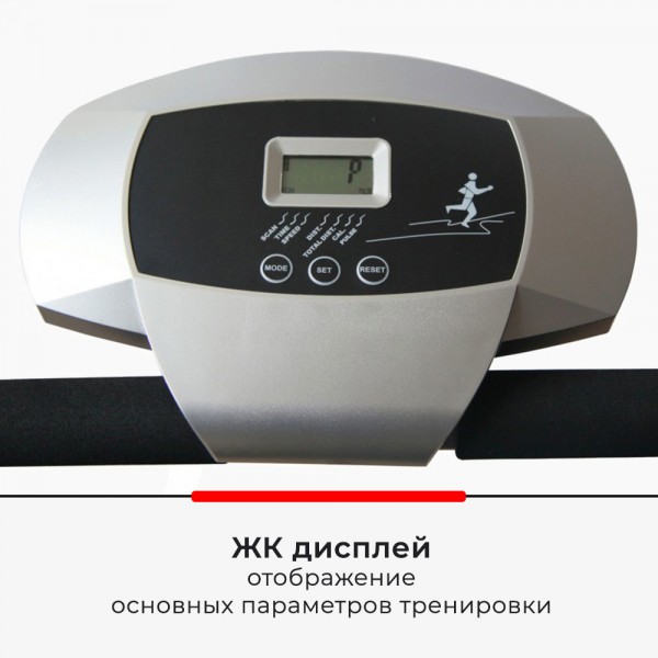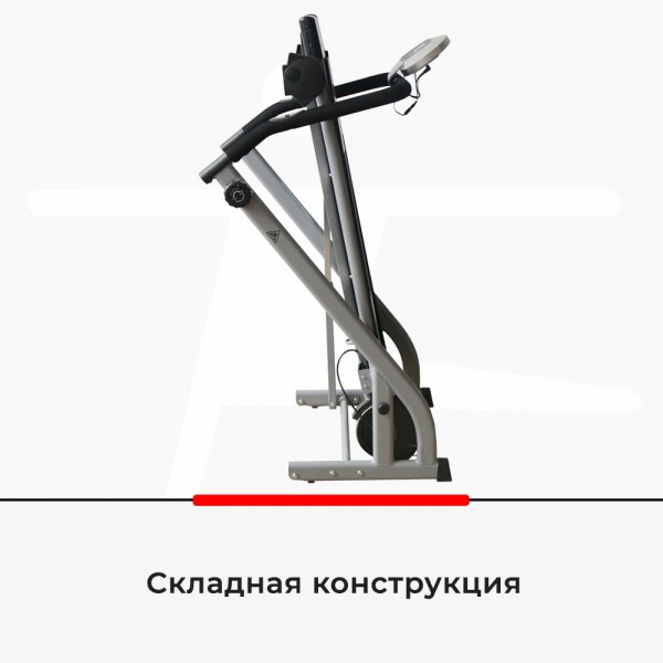 Спортсмен сам выбирает скорость движения, а показатели его пульса считываются датчиками на поручне. Механический переключатель поможет увеличить или уменьшить нагрузку (8 уровней). Тренажер можно сложить.