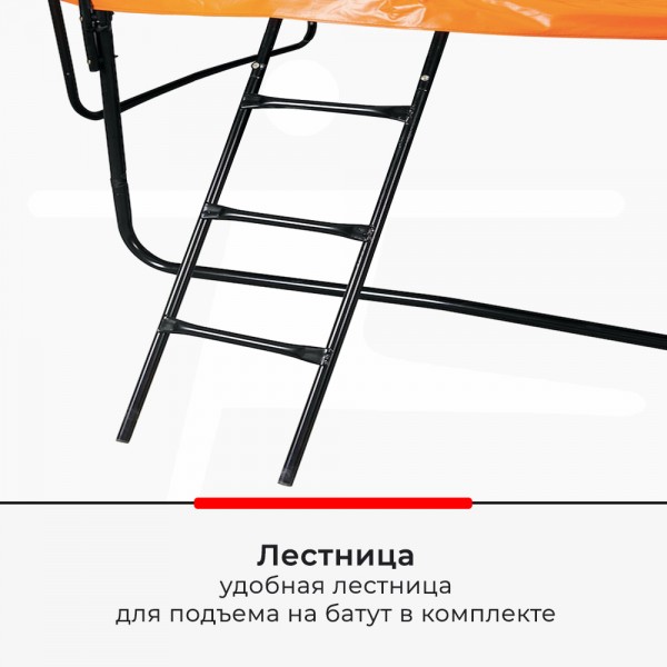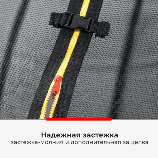 За прыгучесть и безопасность батута отвечают 48 надежных пружин, а рама конструкции изготовлена из гальванизированной стали с толщиной профиля 1,2 мм. Пружинный блок спрятан под защитным чехлом. Прыжковая поверхность выполнена из современного материала Перматрона.