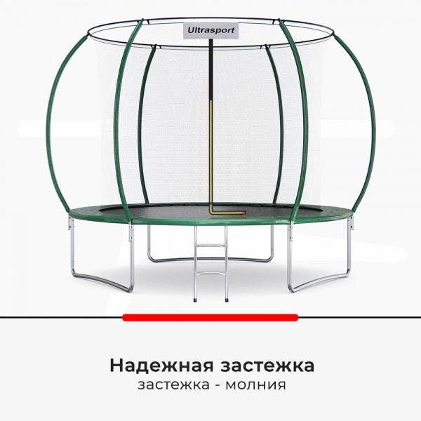 Пружинный блок батута закрыт специальным матом для безопасности прыжков. Для закрытия сетки используется застежка-молния. Прыжковое полотно изготовлена из полипропилена с защитой от воздействия солнца.