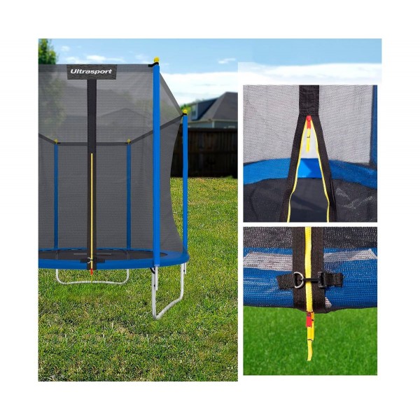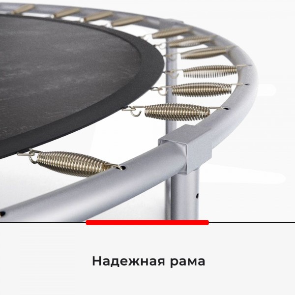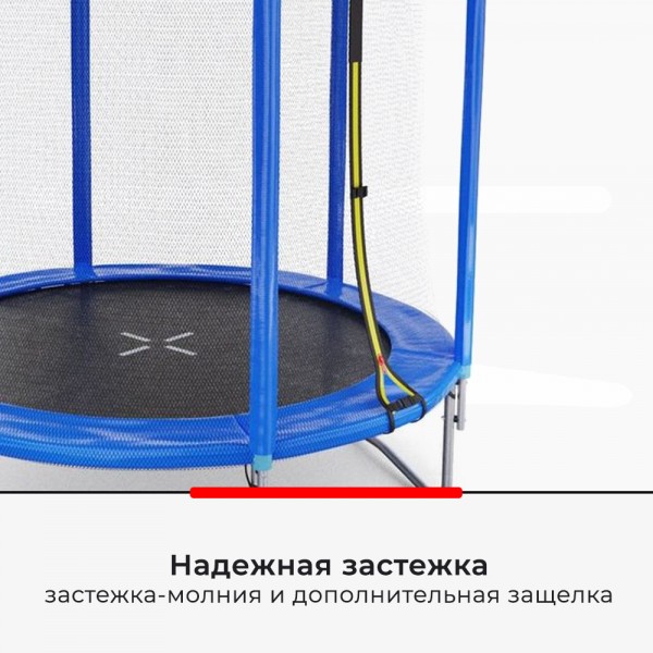 Пружинный блок батута закрыт специальным матом для безопасности прыжков. Для закрытия сетки используется застежка-молния. Прыжковое полотно изготовлена из полипропилена с защитой от воздействия солнца.